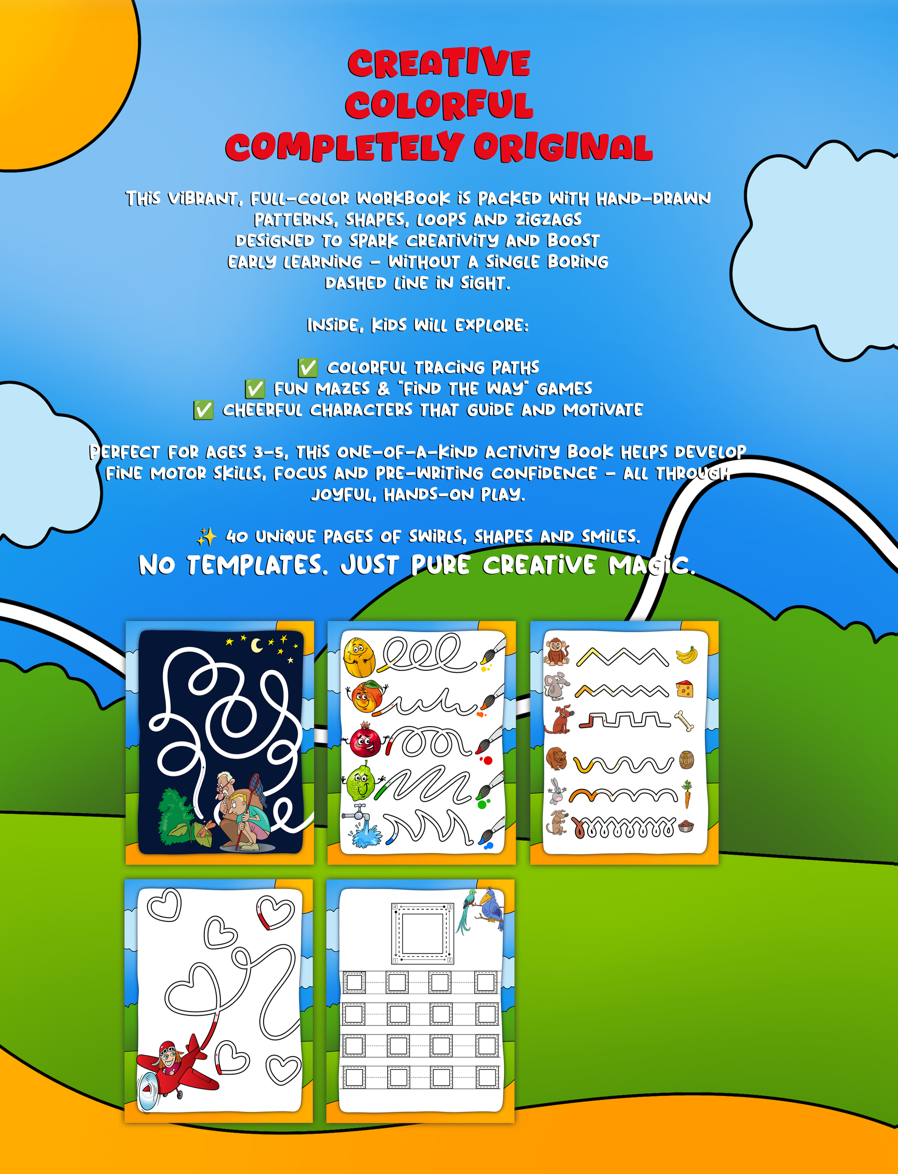 Inside the book, children will discover 40 hand-drawn tracing pages designed with intention and care. Each page combines art and movement to support learning through play.
