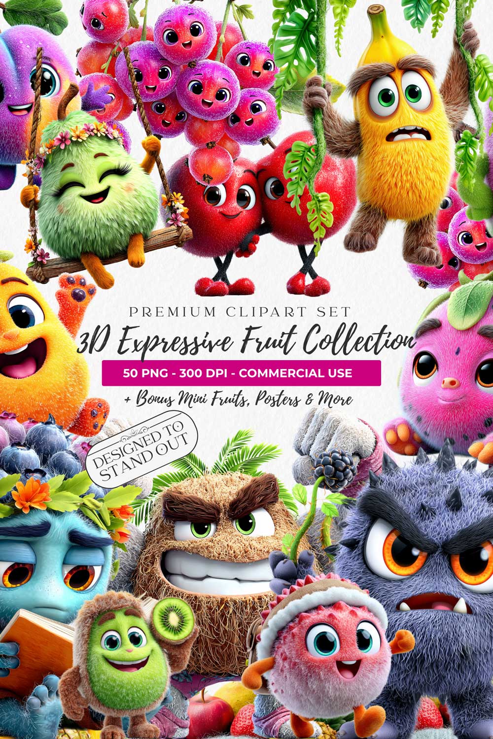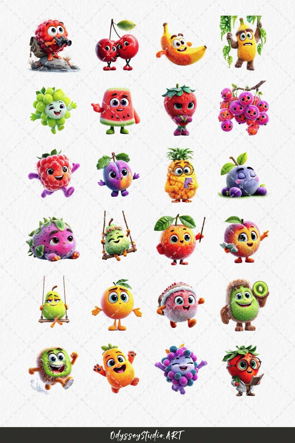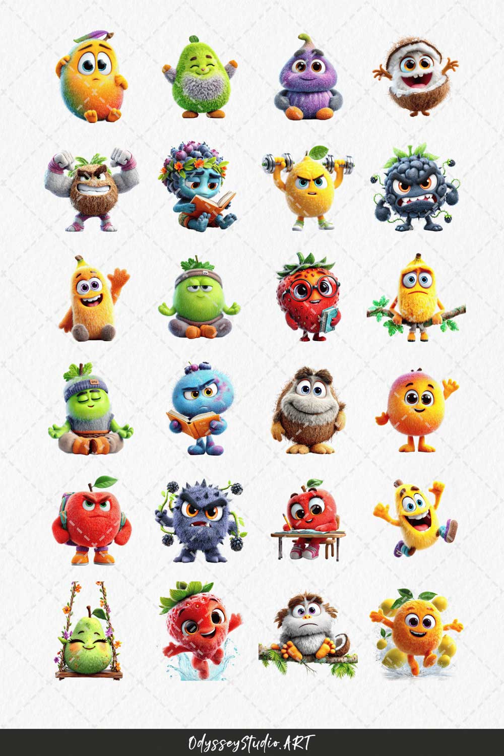 This bundle features a variety of fruit characters designed to feel alive, expressive and engaging: