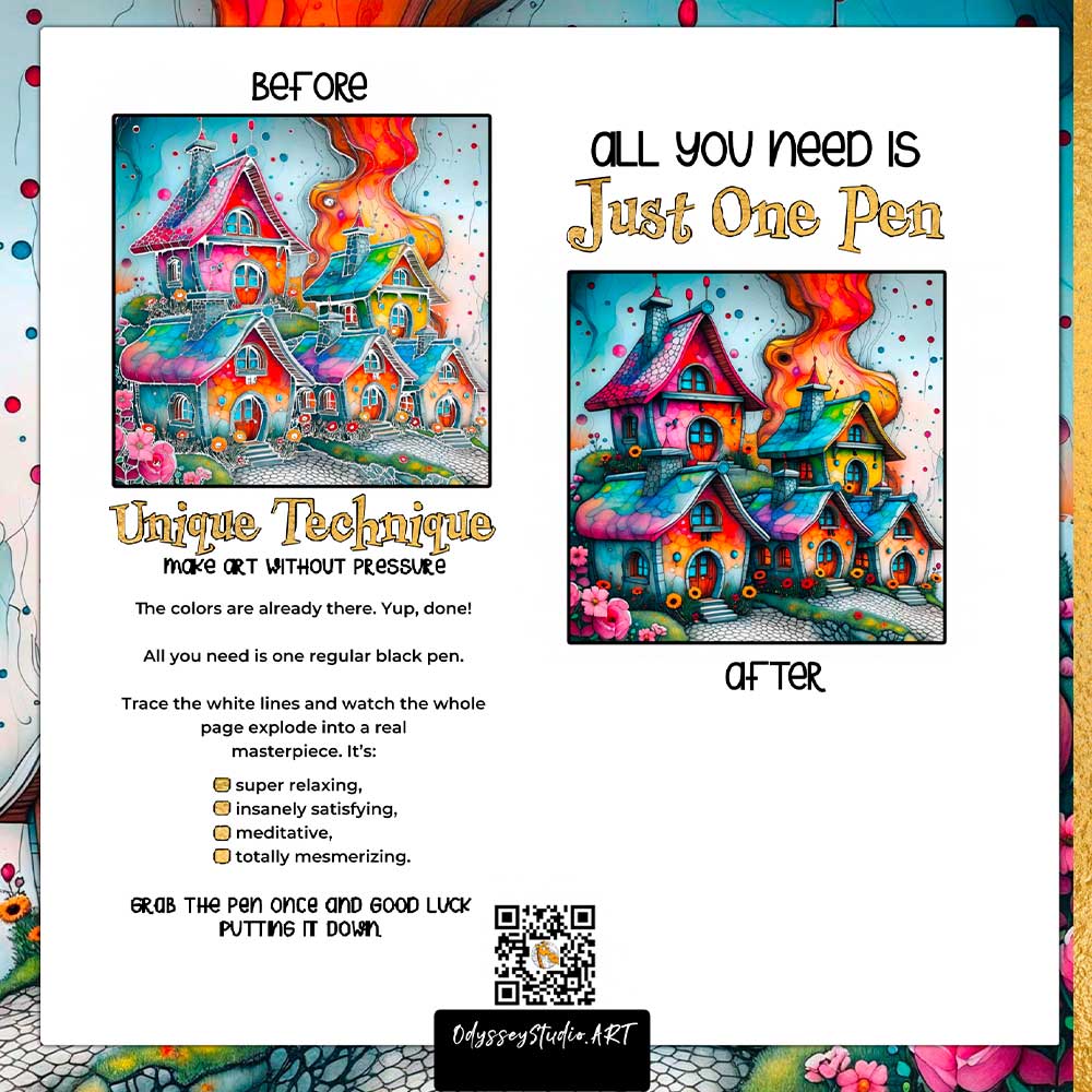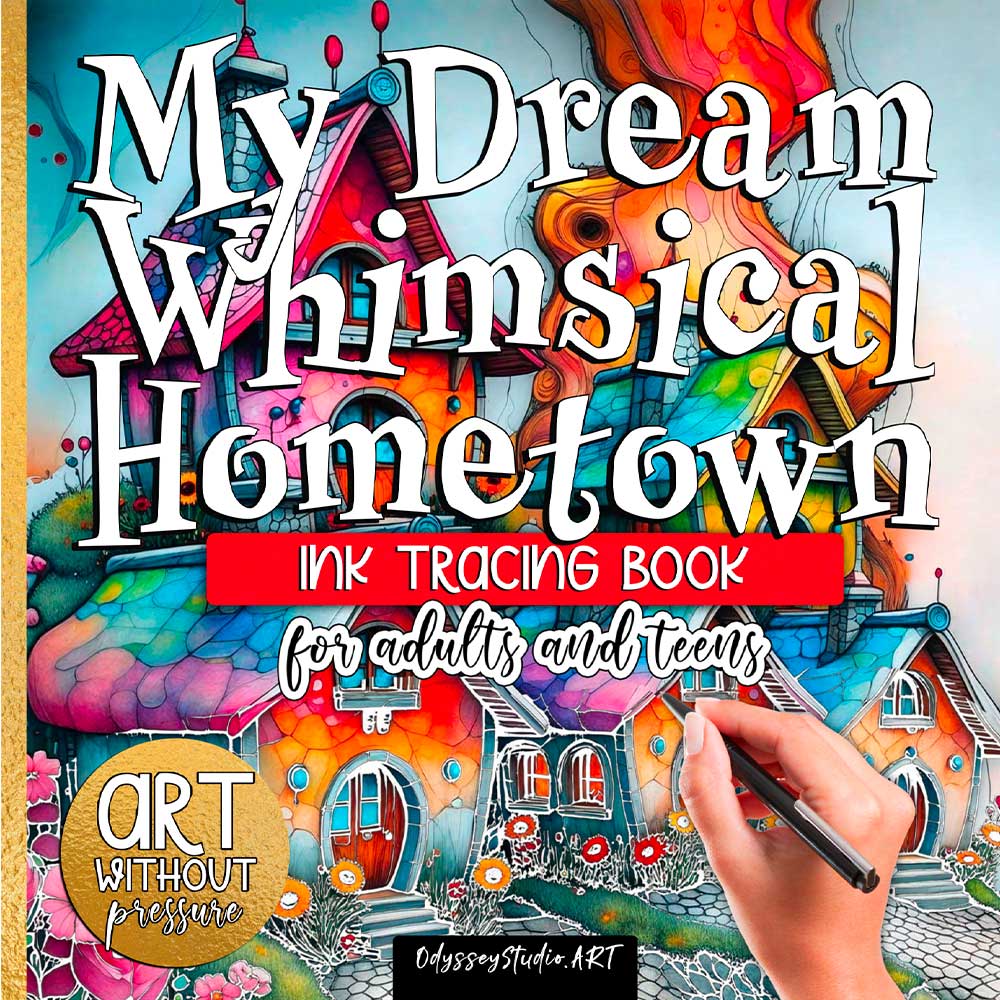 My Dream Whimsical Hometown is a unique reverse coloring and ink tracing book created for sensitive, creative souls who want to draw – without fear, pressure or perfectionism.